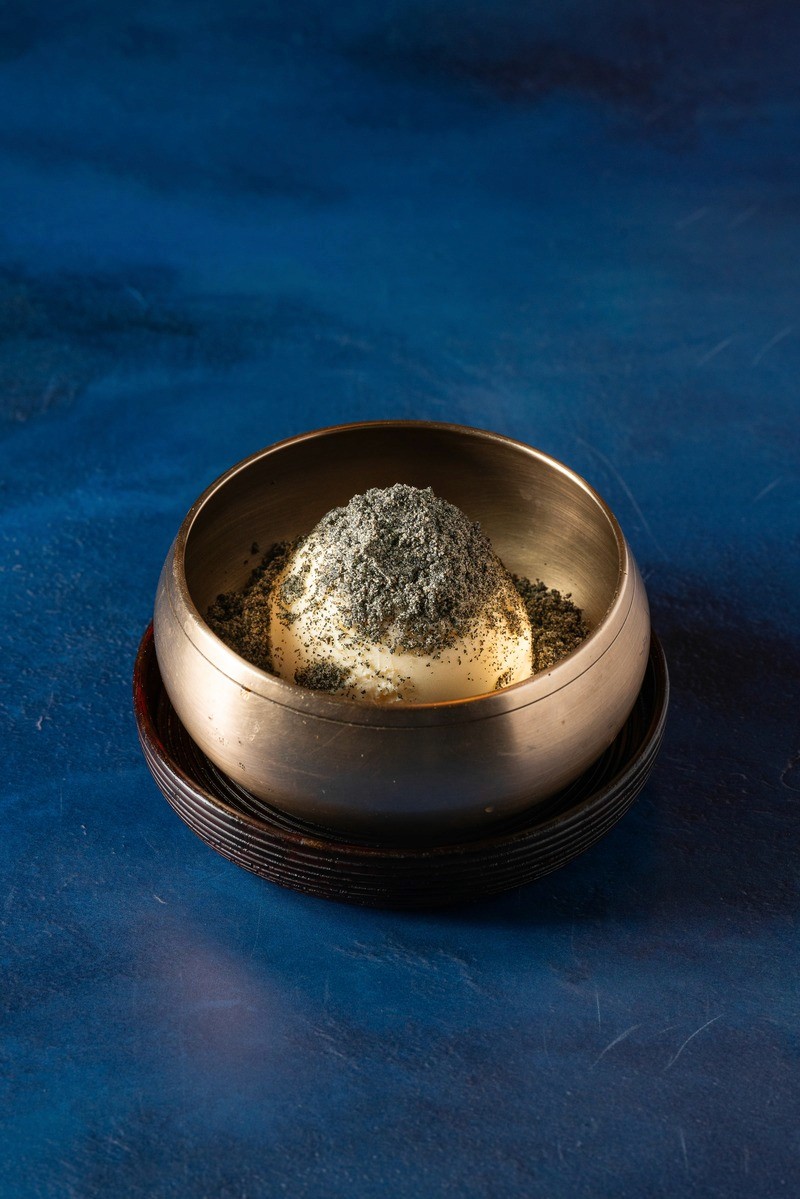 'the orient meets the occident', vanilla ice cream and black sesame powder