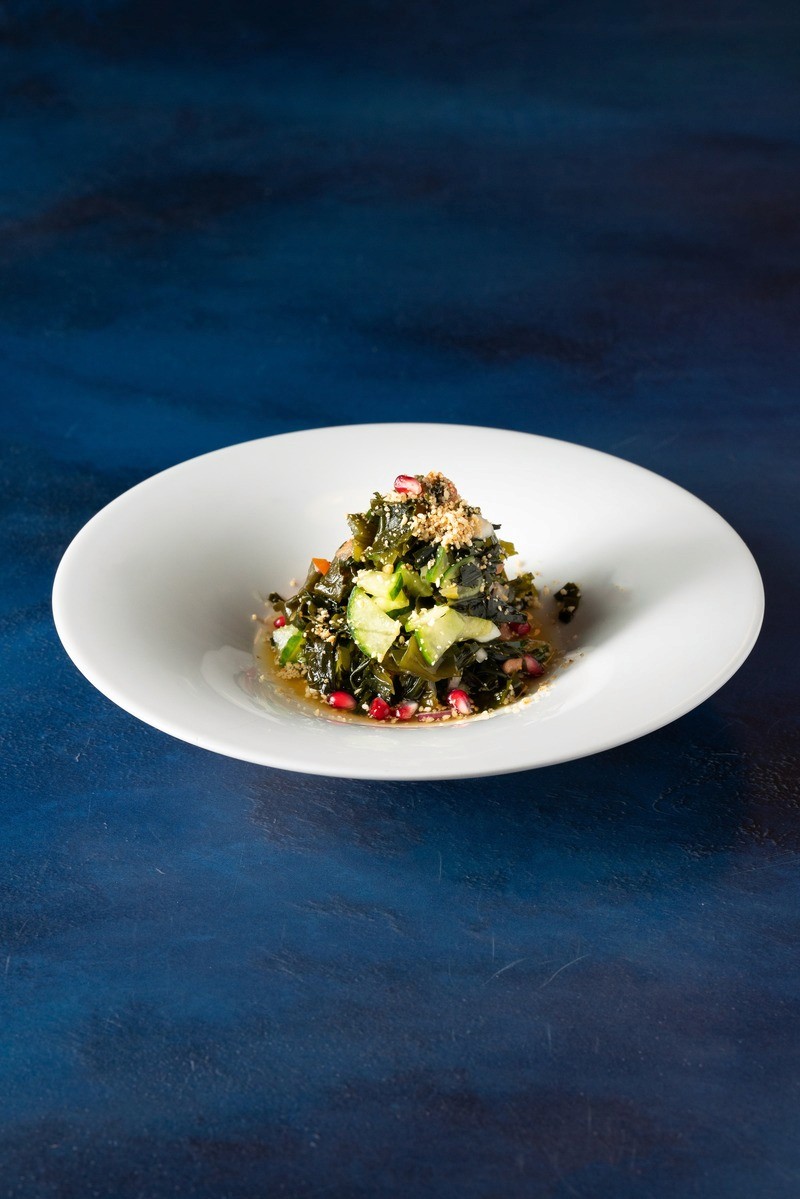 seaweed salad with rice vinegar, cucumber, tomatoes and pomegranate