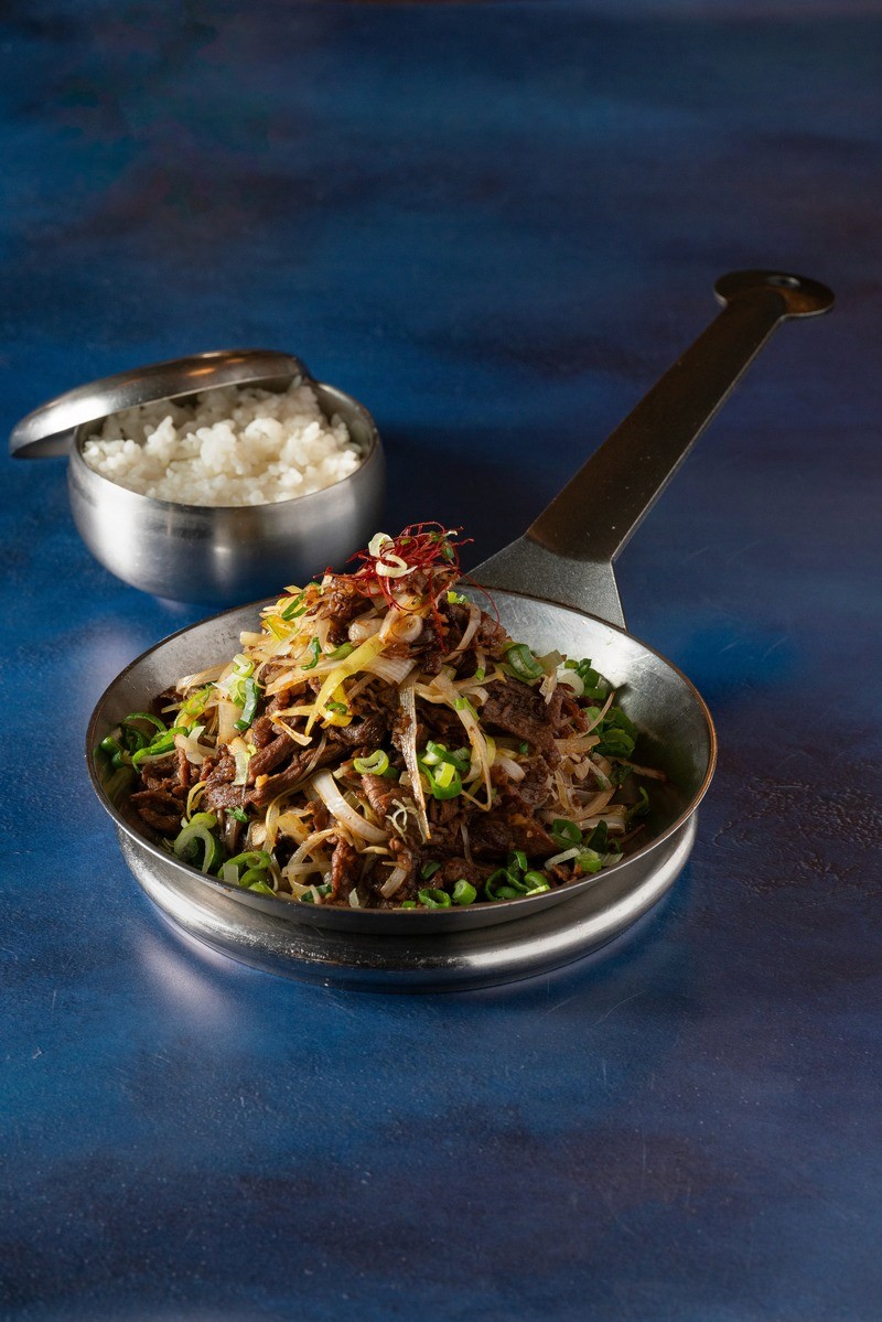 rice with marinated vegetables, seaweed, egg yolk, and bulgogi served very hot in a metal bowl