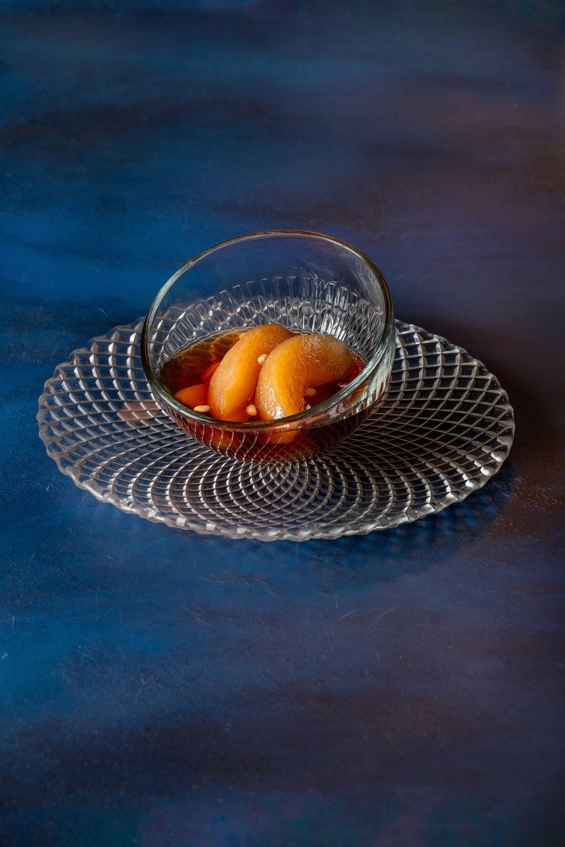korean punch served cold over pear slices with ginger, cinnamon and pine seed