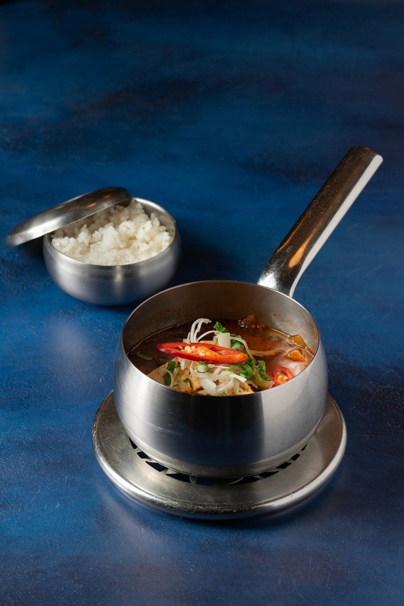 hot kimchi stew with tofu and lightly garnished with red label white tuna