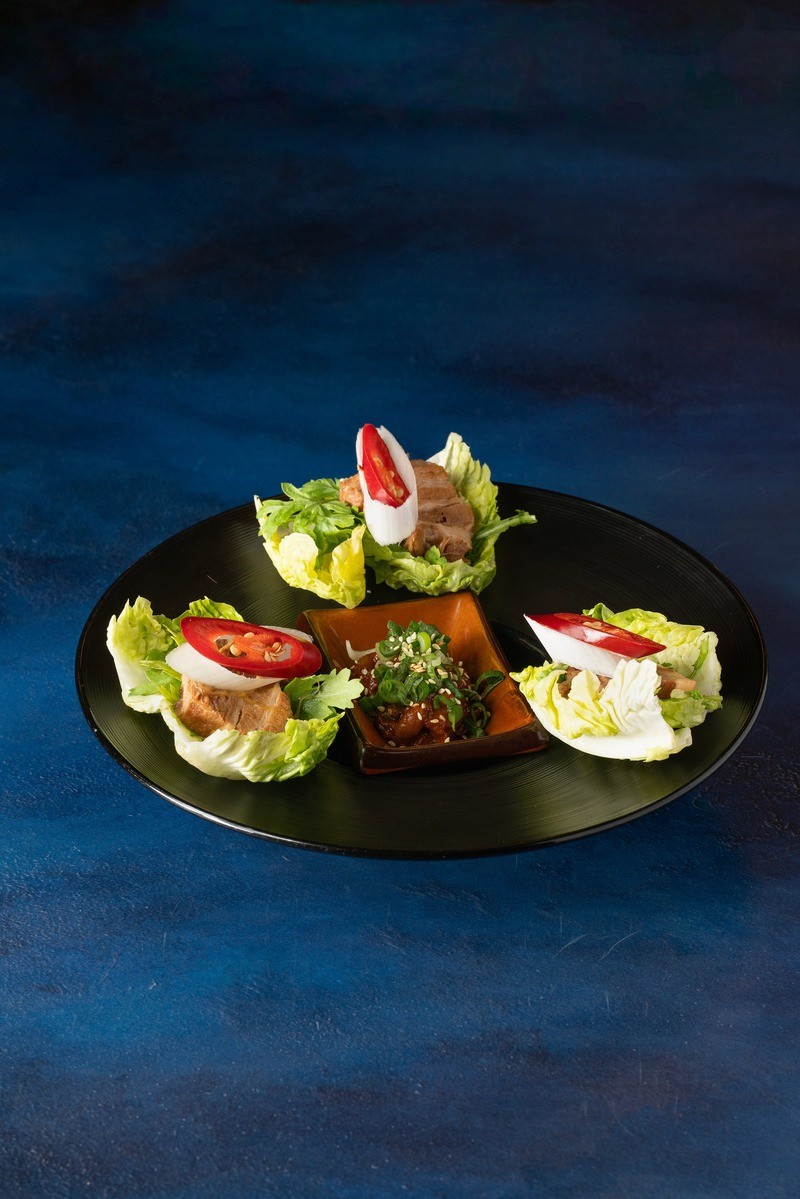 trois wraps de laitue à la poitrine de porc dégraissée et marinée au doënjang épicé